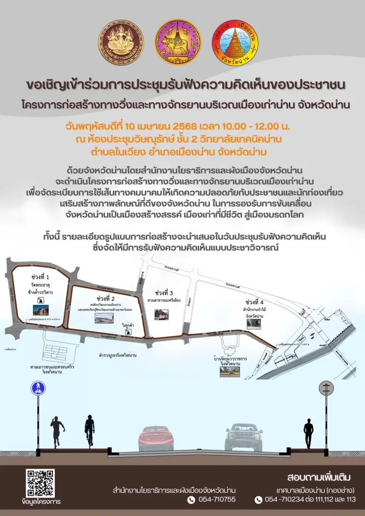 อีกเรื่องคือเส้นทางจักรยานเชื่อมสองเมืองเก่า ซึ่งใช้แก้ปัญหาการขนส่งสาธารณะยังยากลำบาก ด้วยการส่งเสริมใช้จักรยานท่องเที่ยว จึงฝาก ททท.เรื่องความปลอดภัยด้านแสงสว่างจากตัวรถ จัดอบรมเพิ่มความรู้ผู้ประกอบการต่างๆ เนื่องจากหลายโรงแรมที่ให้บริการรถจักรยาน ไม่ได้อยู่ในโซนการท่องเที่ยว แล้วเราจะส่งเสริมการท่องเที่ยวนี้ ผู้ว่าราชการจังหวัดน่านก็พยายามทำเส้นทางดังกล่าวรอบเมือง และถนนพุทธบูชาไปพระบรมธาตุแช่แห้ง อ.ภูเพียง แต่ยังขาดช่วงเป็นตอนๆ เวลาจะขึ้นสะพานพัฒนาภาคเหนือ หรือสะพานศรีบุญเรืองมีความเสี่ยงอันตราย จึงอยากจะแยกเส้นทางจักรยานออกมาต่างหาก