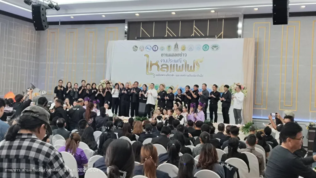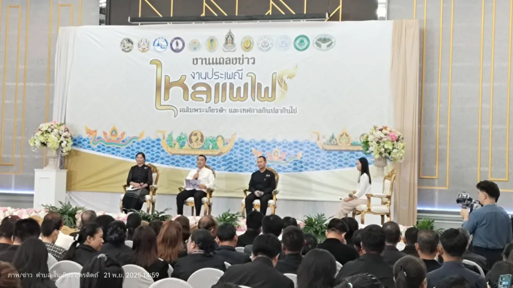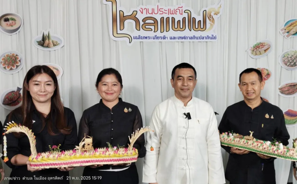ผู้สื่อข่าวรายงานว่าเมื่อวันที่ 21 พฤศจิกายน 2568 เวลา 14.30 น ณ.ห้องประชุมโรงแรมต้นทองรีสอร์ท จัดงานแถลงข่าวเตรียมการจัดงานประเพณีไหลแพไฟเฉลิมพระเกียรติฯและเทศกาลกินปลากินไข่ ประจำปี 2568 โดยการนำของนายสันติ รุงษิรุจิ ผู้ว่าราชการจังหวัดอุตรดิตถ์เป็นประธานการแถลงข่าว พร้อมด้วยนายชลิต ธนวัฒน์ รองนายก อบจ.นาย สุรพันธ์ เจริญทรัพย์ วัฒนธรรมจังหวัดอุตรดิตถ์ นางสาวพรทิพย์ คล้ายชม นายอำเภอตรอน พร้อมด้วยสำนักงาน.ททท.จังหวัดอุตรดิตถ์ หัวหน้าส่วน ทุกภาคส่วน มาร่วมงานแถลงข่าวในครั้งนี้