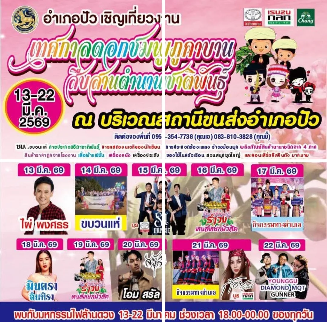 ผู้สื่อข่าวรายงานว่าเมื่อวันที่ 14 มีนาคม 2569 เวลา 19.00น. ที่บริเวณสถานีขนส่งเทศบาลตำบลปัว อำเภอปัว จังหวัดน่าน นางวิไลวรรณ บุดาสา รองผู้ว่าราชการจังหวัดน่าน เป็นประธานในพิธีเปิดงาน เทศกาลดอกชมพูภูคาบาน สืบสานตำนานชาติพันธุ์ อำเภอปัว ประจำปี 2569 โดยมี นายพิพัฒน์ เพ็ชร์พิพัฒน์ นายอำเภอปัว หัวหน้าส่วนราชการ องค์กรปกครองส่วนท้องถิ่น ชมรมกำนันผู้ใหญ่บ้าน ชมรมการท่องเที่ยวอำเภอปัว ตลอดจนประชาชนและนักท่องเที่ยวเข้าร่วมงานจำนวนมาก
