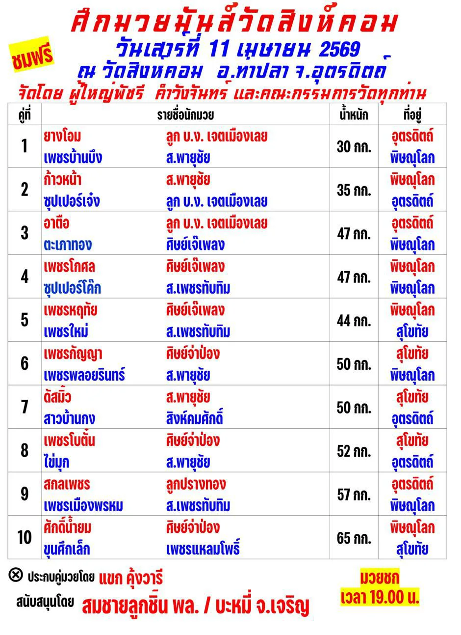 ในวันที่ 10-12 เมษายน 2569 นางสาวพัชรีพร คำวังจันทร์ ผู้ใหญ่บ้าน หมู่ที่ 7 บ้านสิงห์คอมพัฒนา ขอเชิญเที่ยวงานพิธีสมโภชสมณศักดิ์พัดยศ พระครูพิพิธปัญญาโสภณ พระบัญชาแต่งตั้งพระอุปัชฌาย์ และตราตั้งเจ้าคณะตำบลท่าปลาเขต ๒