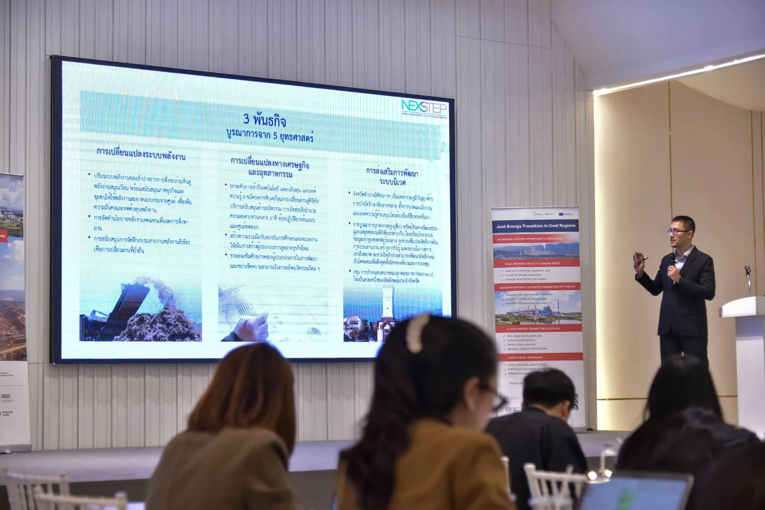 ภายในงานมีการแถลงผลการศึกษา ประกอบด้วย การศึกษาการจัดทำแผนการเปลี่ยนผ่านด้านพลังงานและเศรษฐกิจของจังหวัดลำปางอย่างเป็นธรรม โดยคุณสุชาติคล้ายแก้ว หัวหน้าโครงการ IKI JET, GIZ ประเทศไทย, ผลการศึกษาการปิดเหมือง ผลกระทบต่อสิ่งแวดล้อม และการฟื้นฟูพื้นที่ในประเทศไทย กรณีศึกษาเหมืองแม่เมาะ จังหวัดลำปาง โดย ผศ.ดร.พิพัฒน์ เหล่าวัฒนบัณฑิต ภาควิชาวิศวกรรมเหมืองแร่และปิโตรเลียม จุฬาลงกรณ์มหาวิทยาลัย, การศึกษาเชิงวิเคราะห์เพื่อระบุกลไกทางการเงินสำหรับการดึงดูดการลงทุนในจังหวัดลำปาง โดยคุณจิรวัฒน์ ยุทธประเวศน์ ที่ปรึกษาโครงการจัดทำแผนยุทธศาสตร์การเปลี่ยนผ่านด้านพลังงาน (ESCAP) และการบรรยายกลไกการขับเคลื่อนการพัฒนาเศรษฐกิจของจังหวัดลำปางอย่างยั่งยืน โดย คุณพีระรักษ์ พิชญกุล ประธานหอการค้าจังหวัดลำปาง ในช่วงท้ายของการแถลงผลการดำเนินงานผู้เข้าร่วมประชุมได้แลกเปลี่ยนความคิดเห็น ข้อเสนอแนะต่อแผนการเปลี่ยนผ่านด้านพลังงานและเศรษฐกิจของจังหวัดลำปางอย่างเป็นธรรมร่วมกัน